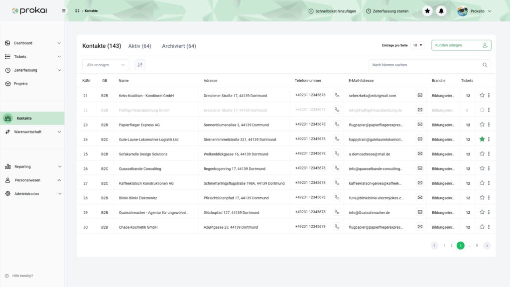 Erstellen und managen Sie Ihre Kontakte zentral an einem Ort. Verbinden Sie Kunden direkt mit zugehörigen Projekten sowie Tickets und rechnen Sie über prokai ab.