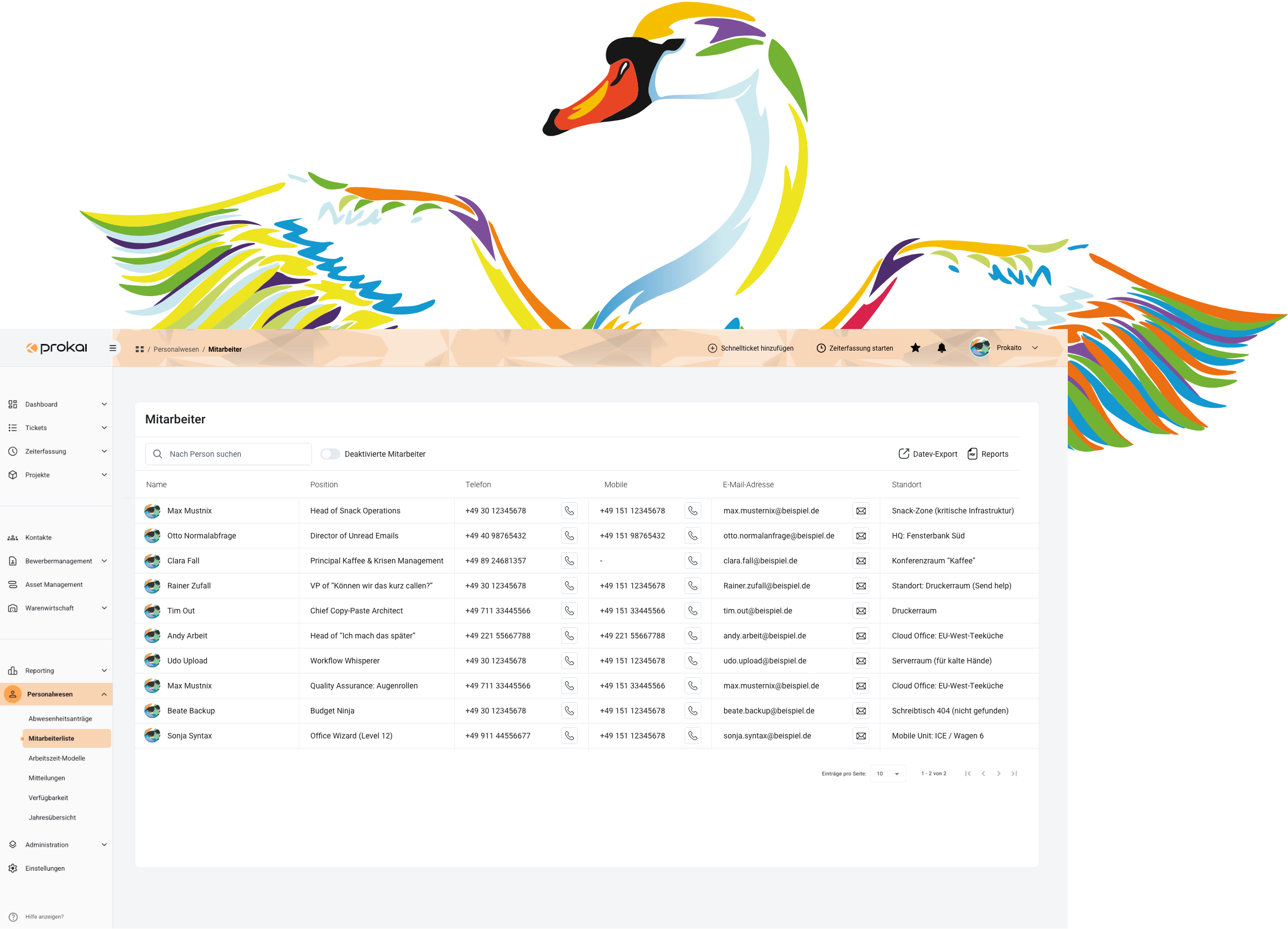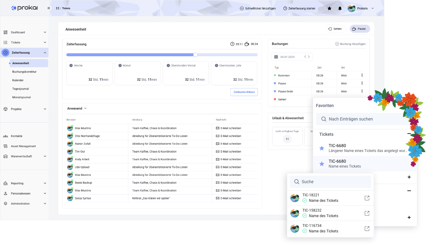 Mit prokai wird EIN Tool das Herz Ihres Unternehmens, und Sie sind immer direkt am Puls: Behalten Sie alle Kernprozesse jederzeit im Blick. Ob Mitarbeiter, Kunde, Projekt, Arbeits- oder Leistungszeitenden: den Fokus wählen Sie.