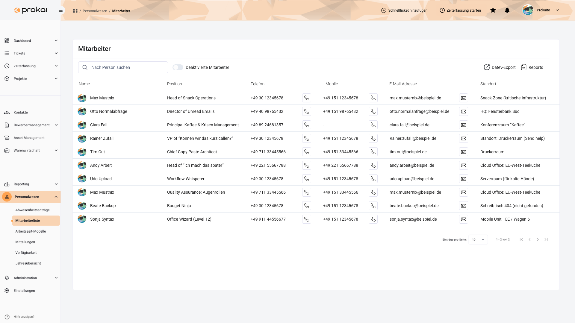 Managen Sie externe wie interne Anfragen mit dem integrierten prokai Ticketsystem. Ideal, um ein Helpdesk für HR-Anfragen einzurichten oder Projekte erfolgreich umzusetzen. Mitarbeiter bearbeiten interne und externe Tickets in prokai zentral und wechseln nahtlos zwischen Support- und Projekt-Tickets. Intuitiv und maximal effizient – alles in einem Tool.