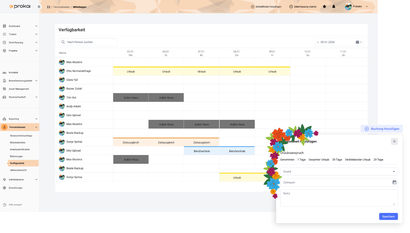 Abwesenheiten ganz einfach in prokai planen und verwalten. Mitarbeiter reichen via prokai mit wenigen Klicks Urlaub zur Genehmigung ein. Homeoffice (auf Wunsch ebenfalls genehmigungspflichtig), Geschäftsreisen und weitere Abwesenheiten lassen sich ebenfalls planen und über einen unternehmensweiten Kalender einsehen.