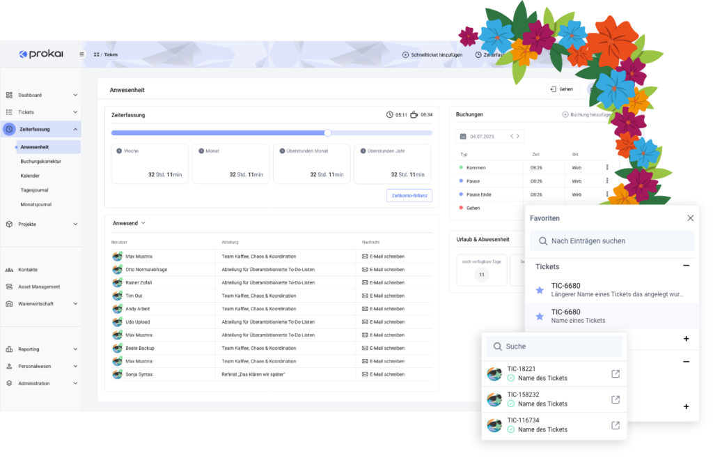 prokai unterstützt Sie dabei, HR und Team-Workflows zentral zu organisieren: digitale Personalakte, Arbeits- und Projektzeiterfassung, Urlaubsplanung & Abwesenheitskalender sowie Projektmanagement & Tickets.